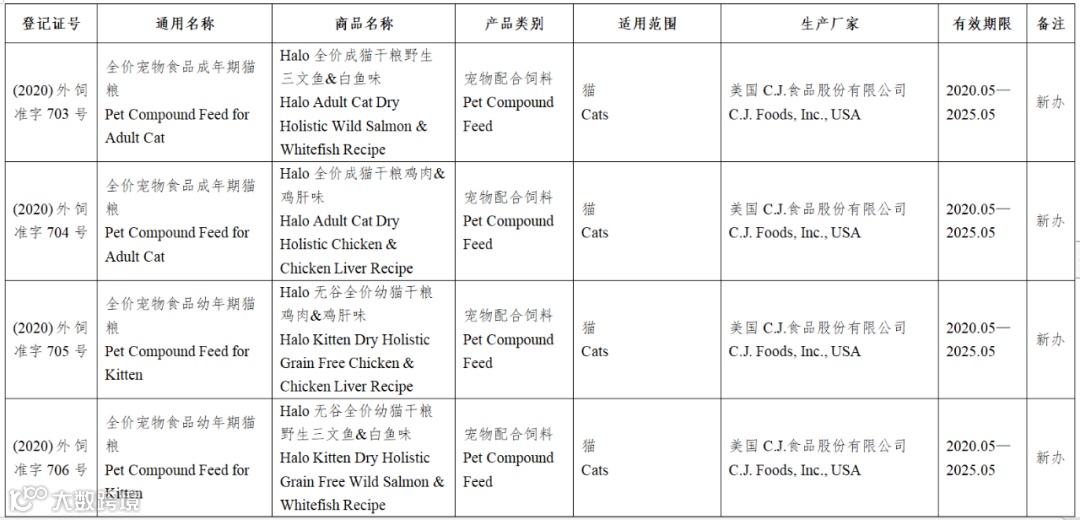 美国C.J.食品股份有限公司生产的全价宠物食品成年期猫粮——Halo全价成猫干粮野生三文鱼&白鱼味,Halo全价成猫干粮鸡肉&鸡肝味,Halo无谷全价室内猫干粮健美体态鸡肉&鸡肝味,Halo无谷全价室内猫干粮健美体态野生三文鱼&白鱼味,Halo全价猫干粮敏感肠胃海鲜味;