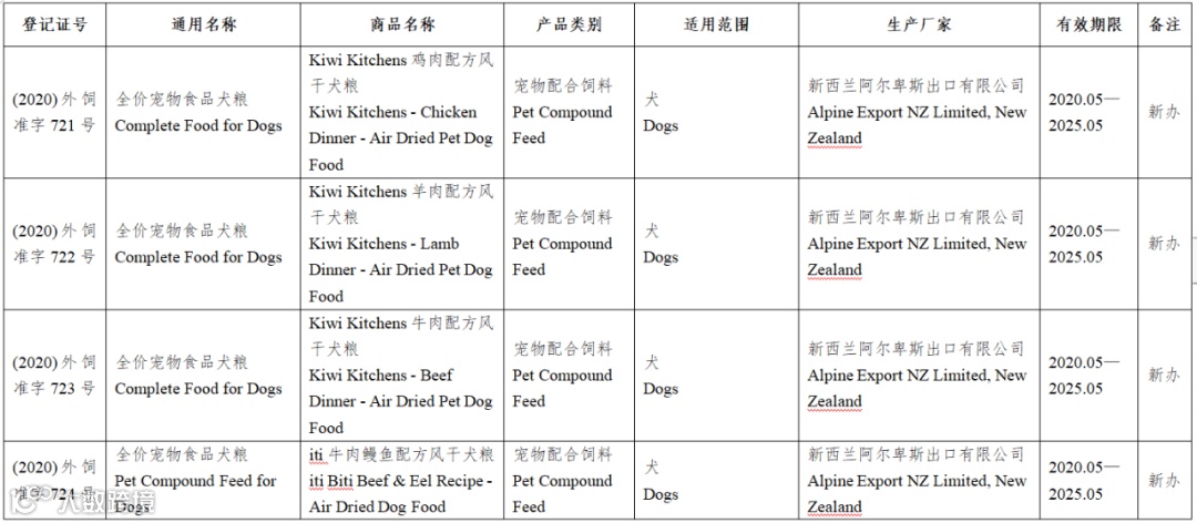 13、新西兰阿尔卑斯出口有限公司生产的全价宠物食品犬粮——Kiwi Kitchens鸡肉配方风干犬粮,Kiwi Kitchens羊肉配方风干犬粮,Kiwi Kitchens牛肉配方风干犬粮,iti牛肉鳗鱼配方风干犬粮,iti羊肉卡瓦鱼配方风干犬粮,iti羊肉鹿肉配方风干犬粮,iti鸡肉配方风干犬粮,iti牛肉配方风干犬粮。