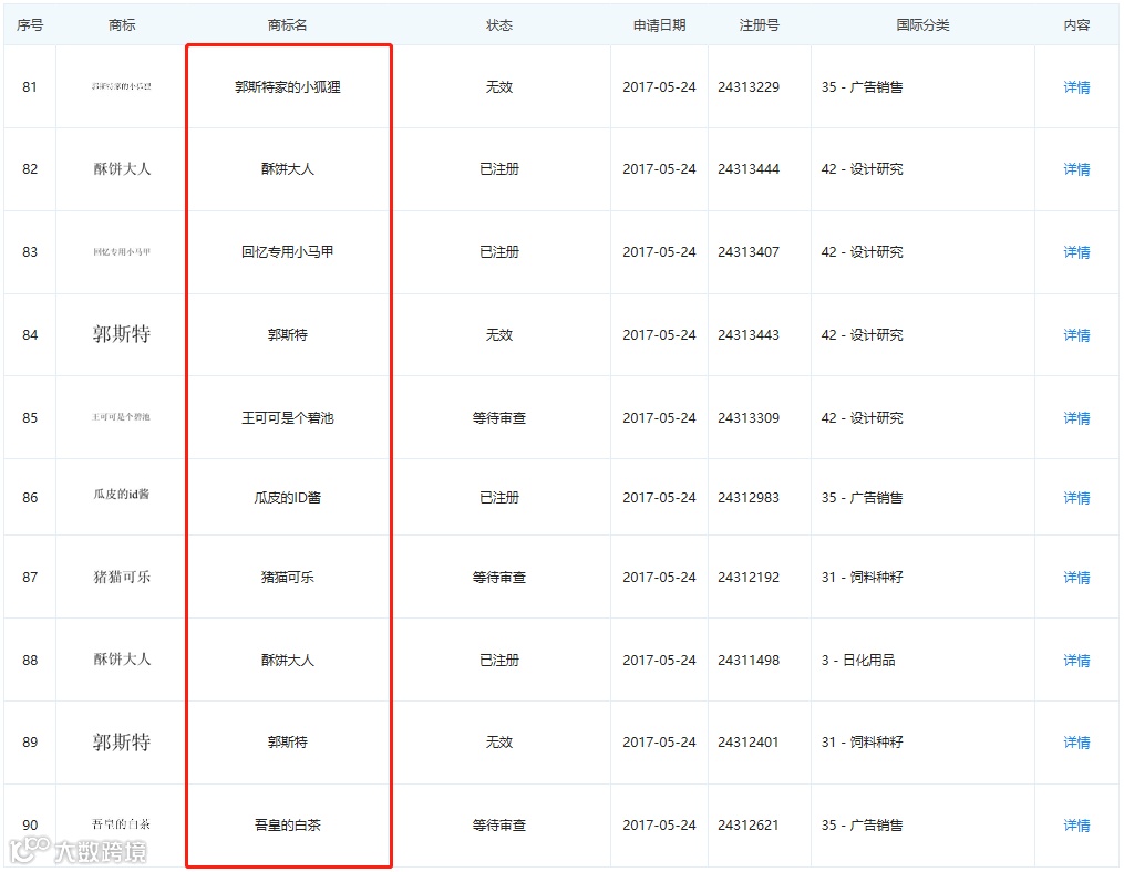 除了这些或已注册或等待审查的商标外,该公司还有一些显示为无效的商标,比如该公司注册的郭斯特商标以及郭斯特家的小狐狸等都显示为无效。不得不说,这家皇家控股(法國)有限公司对于微博上的萌宠KOL们还是有一定的关注和了解的。