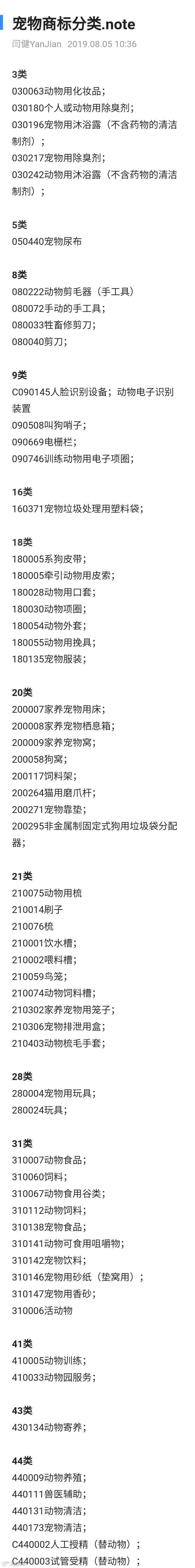 结语:知识产权目前一直是各个企业的无形资产,大家都要重视起来,不然付出的就是高昂的代价。最后,小编给大家分享一个宠业家群友分享给小编的宠物商标分类,感兴趣的可以收藏一下哦。