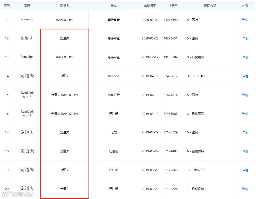据企查查数据显示,该公司从2016年12月-2020年3月先后注册有109个商标。其中,宠道夫、夫宠到、宠夫道、宠首夫之类40个商标、蒙田大道3个、盼斯兔5个、两条鱼11个、两只鱼8个、两条小鱼3个等,此外,还有瓜皮的ID酱、回忆专用小马甲、郭斯特、酥饼大人、王可可、吾皇的白茶、瓜皮猫、贝多芬等相关词条的商标。