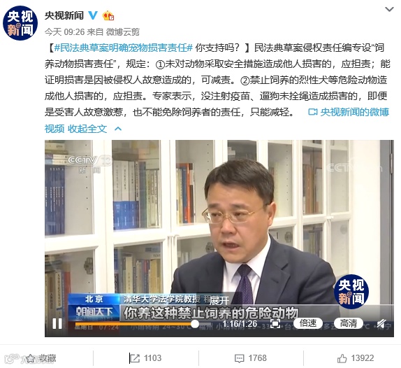 5月17日,央视新闻发布消息,民法典草案侵权责任编专设“饲养动物损害责任”,规定了两种情形不能减责和免责: