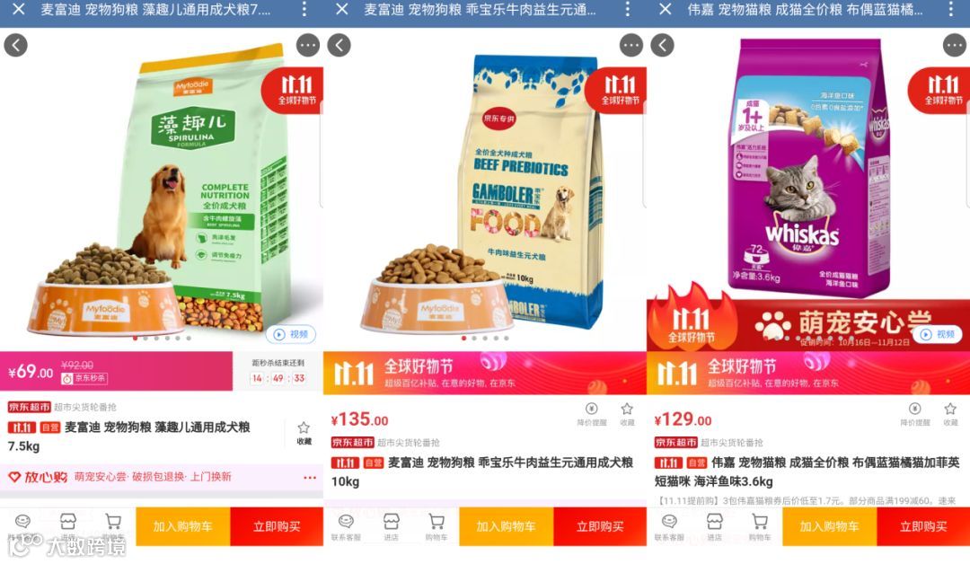 其中,麦富迪藻趣儿狗粮、伟嘉成猫全价粮、洁客膨润土猫砂、LORDE里兜豆腐猫砂2.0升级版、LORDE豆腐猫砂、比瑞吉俱乐部狗粮、宠幸豆腐猫砂登上了TOP10。值得一提的是,麦富迪藻趣儿狗粮与伟嘉成猫全价粮依然保持领先优势。