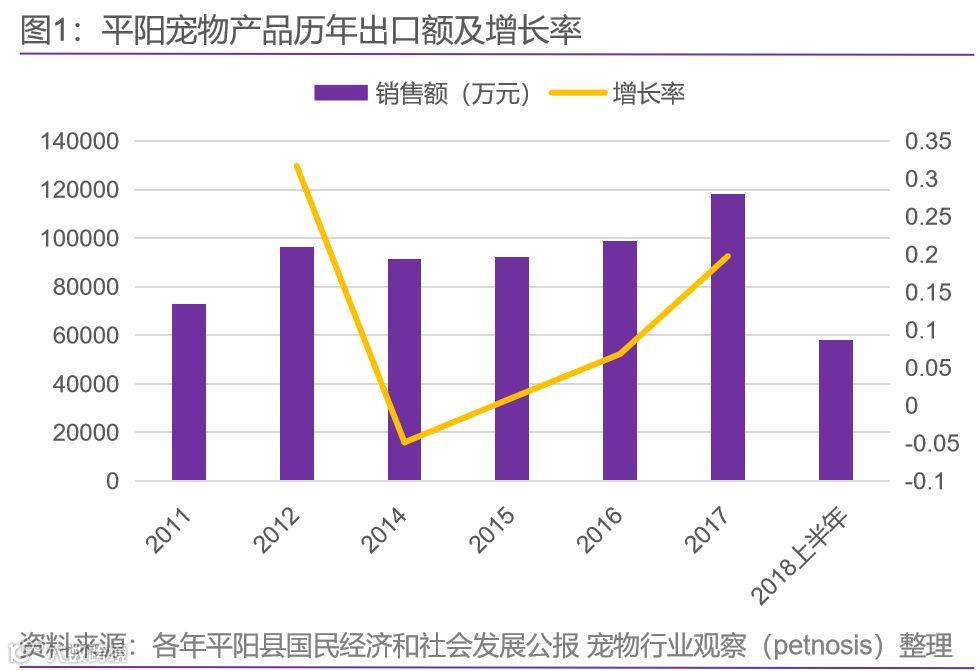 据《2017年平阳县国民经济和社会发展统计公报》显示,2017年宠物用品行业出口额,在平阳县总出口额超过20%,比上年增长20%,出口额近12亿人民币。而这仅仅是冰山一角,实际上,平阳县宠物用品行业产值已从2014年的25亿发展到2016年的33亿,年复合增长15%,且自2008年以来,宠物食品出口连续9年保持县外贸出口第一大支柱产业地位。目前,全县100多家宠物用品企业,其中规模以上企业已达到35家。