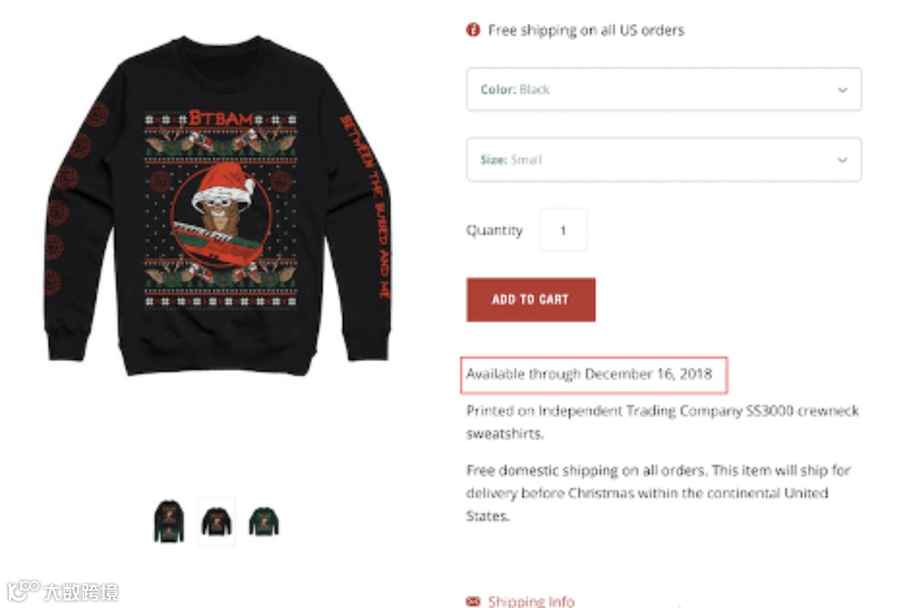 这是一件漂亮的假日圆领运动衫,在美国可以享受免费送货,但仅在特定时期内可用。这是用于设计电子商务商店的紧迫性的一个典型例子。