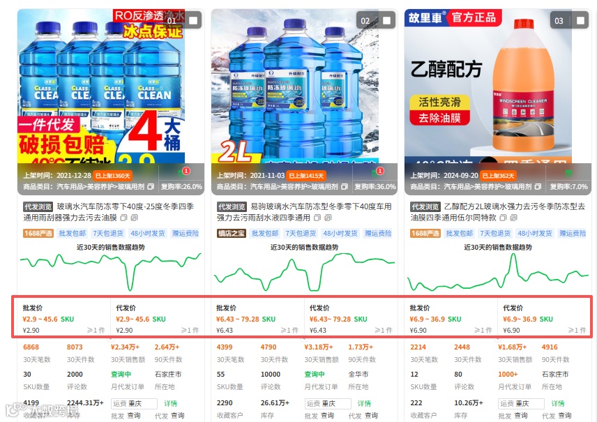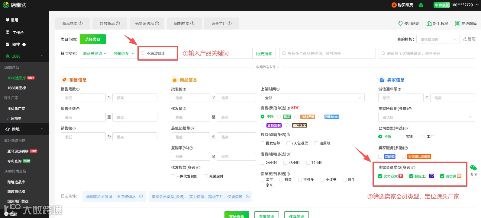 俄罗斯冬季漫长,长达6个月,且积雪较厚,汽配类目选品思路可以从冬季防滑轮胎、不冻玻璃水、冬季加厚款雨刮片、车载取暖坐垫、防滑链等冬季刚需的产品,卖家可以通过店雷达跨境选品工具,关键词输入“不冻玻璃水”,卖家会员类型选择实力卖家、超级工厂、诚信通,溯源1688源头工厂,拿到高性价比的货源。