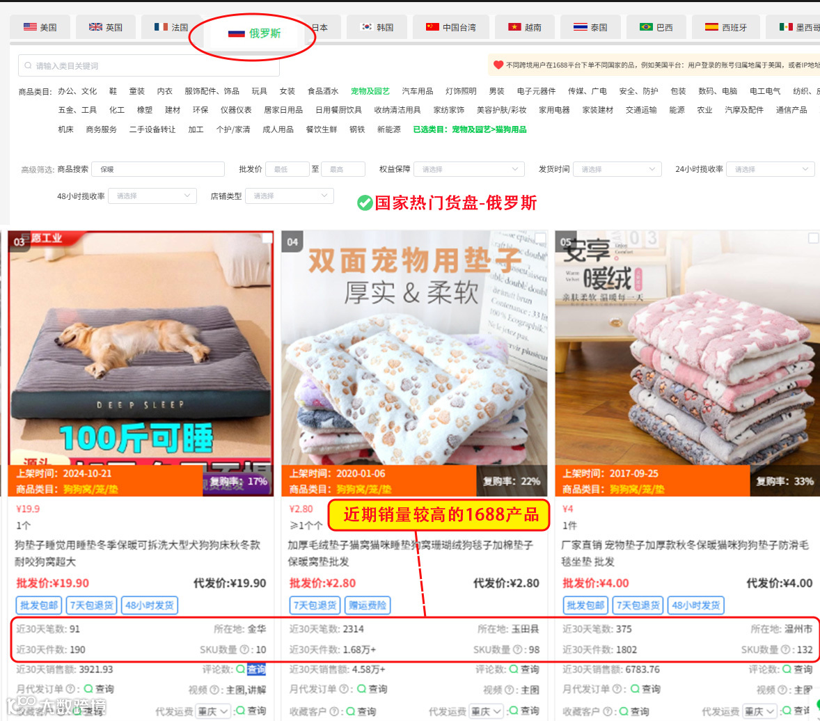 在西伯利亚地区,气温最低可到零下40度,宠物毛衣、保暖防水狗鞋、保暖狗窝猫窝等产品都较为畅销,卖家选品时需注意俄罗斯大型犬较多,避免尺寸选错问题。通过店雷达国家热门货盘,可查看俄罗斯近30天热销的产品,以猫狗用品为例,可以看到近期保暖的宠物垫子销量较高,需求较大,卖家从中作为选品参考。