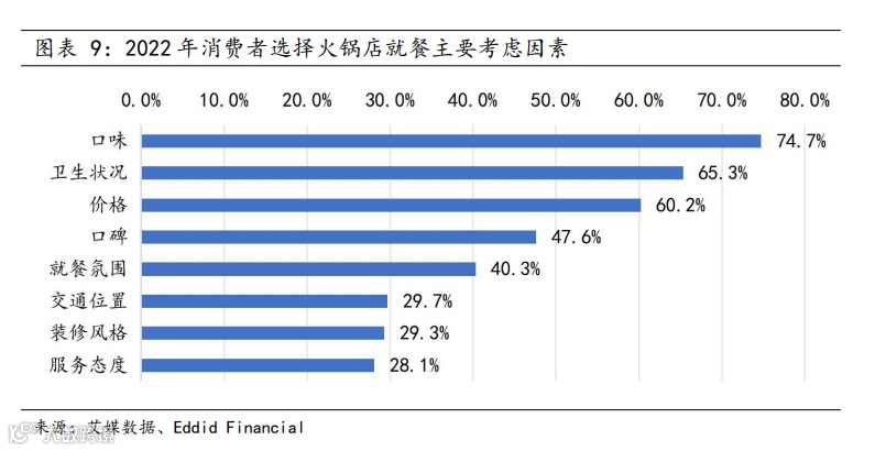 艾德证券期货研报显示,2022 年,消费者选择火锅店就餐主要考虑因素中,口味排名第一,占比高达74.7%。这正是主打极致口味的巴奴可以异军突起的关键诱因。