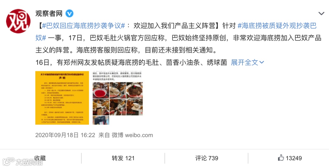 早在2020年9月,观察者网就报道称,海底捞的毛肚、茴香小油条、绣球菌等菜品及其摆盘方式与巴奴“撞车”。对此,巴奴发布声明称:“海底捞是一家值得尊敬的企业,非常欢迎海底捞加入巴奴产品主义的阵营。”