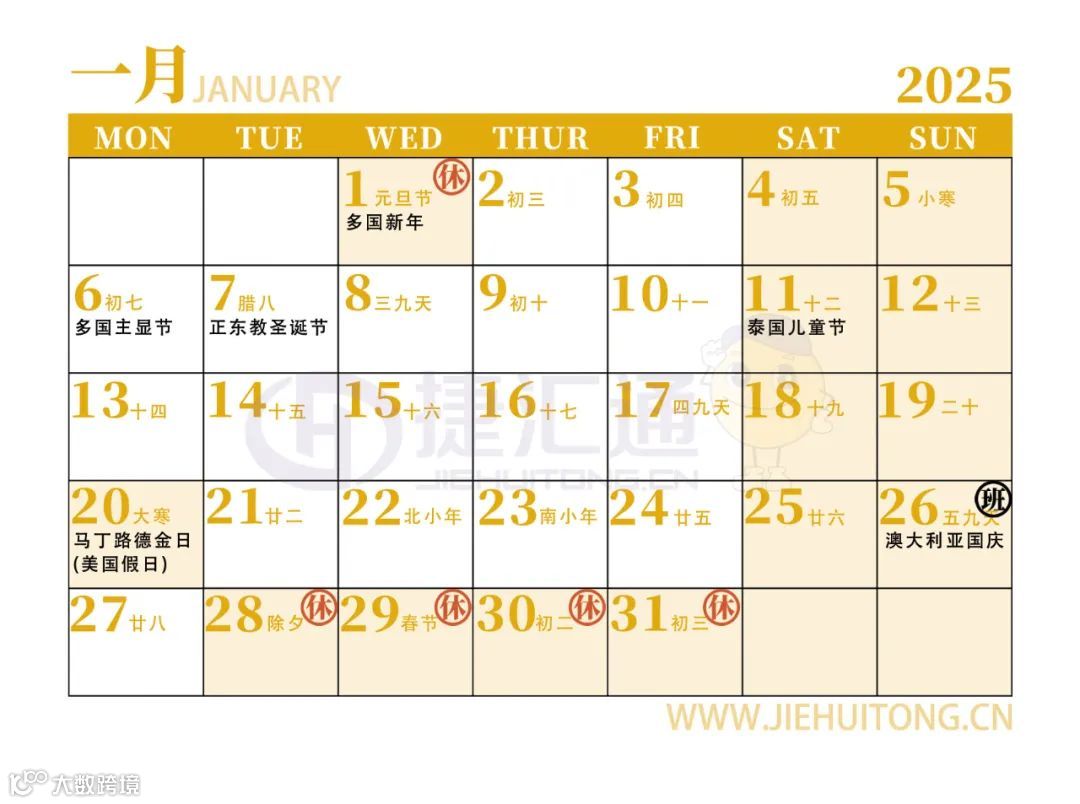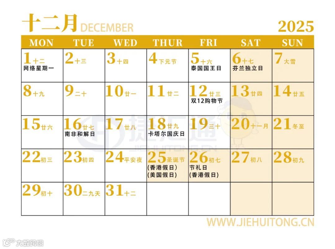 捷汇通始终致力于为广大外贸人提供最专业的全球收款结算服务。我们希望,这份外贸营销日历能为您提供营销建议,助您抢占市场先机!以下日历,阴影框表示暂停换汇,其中美国假日可能影响美元入账时效,香港假日可能影响人民币下发时效。放假期间,充值、收款、全球付款、提现业务提交不受影响,银行恢复营业后会按提交顺序自动处理。