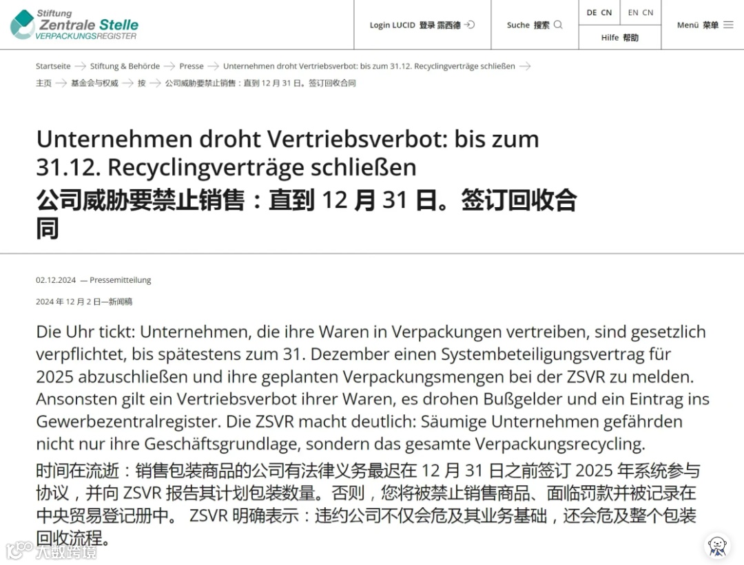 因此,每年年底前,商家需向二元制回收系统和德国包装品中央登记处(LUCID)申报预测的包装数量。无论是新用户还是老用户,都应及时完成预估数量申报,以避免合规风险。