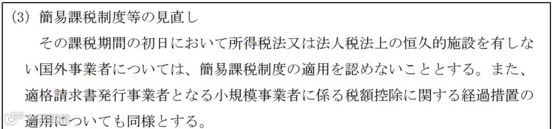 简易课税制度 :未在日本境内设有恒久设施(如长期办公室)的或没有企业所得税纳税义务的国外经营者,将无法继续使用简易课税制度。