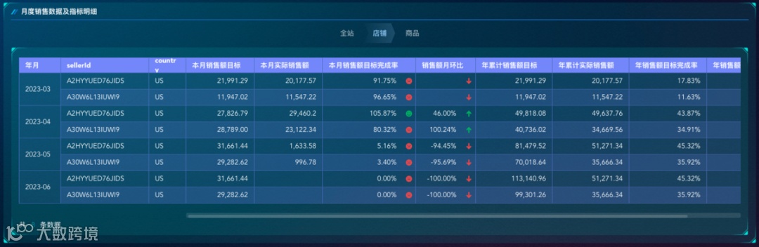 销售数据及指标明细主要分为三个层面:全站、店铺和商品。通过特殊符号为全站、店铺、商品标注了目标销售额完成率以及销售额环比,能够及时帮助经营者了解从平台到店铺到具体商品ASIN的销售情况,全面了解自身在跨境电商市场上的表现。