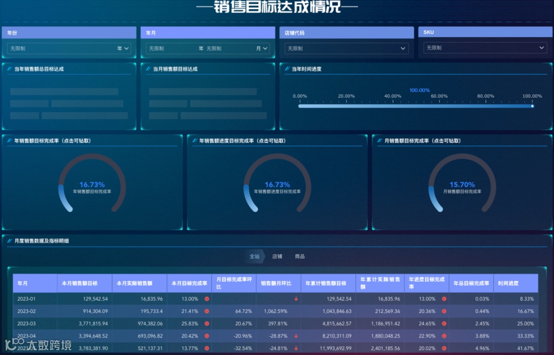数跨境BI的销售绩效分析看板,通过直接对接亚马逊等平台数据,实现销售进度的可视化监控。在看板中,管理者可随时查看年/月度销售目标完成率、店铺进度排行、SKU销售贡献等关键指标,及时发现偏差。
