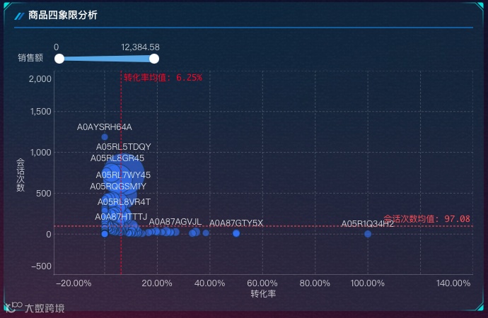以销售额、转化率、曝光量或会话次数为核心维度,将商品划分为 明星商品、问题商品、 淘汰商品、潜力商品4 个象限。根据象限划分每种商品在市场中的表现,并制定相应的营销策略和产品发展计划。