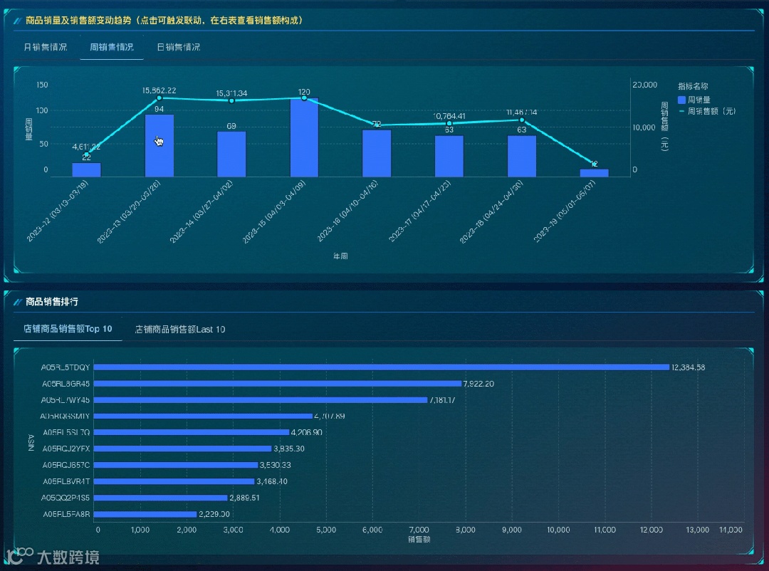 通过指标卡展示年/月销量、销售额及目标完成率,帮助企业清晰对比目标与实际的差距;点击钻取至店铺或ASIN,追踪问题来源。