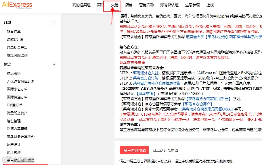 注意:若申请仓库为英德两国海外仓,请完成上述操作后继续进行左侧“第三方仓申请”完成VAT提交;若仓库非英德两国海外仓,不需要在AE后台提交申请,请按照上述步骤操作即可。捷网/如易认证仓请走AE平台第三方仓申请流程,详情可跟对应仓库销售/客服咨询。