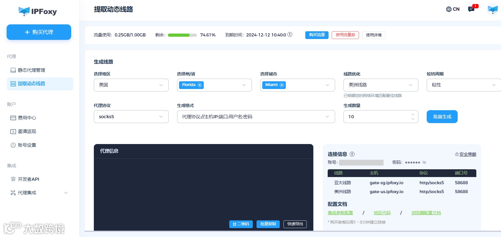 要确保广告投放效果、收集广告的真实数据、避免广告欺诈,使用动态代理轮换IP可以有效模拟不同的普通用户,防止被网站标记,还可以辅助检验在同地区或不同地区用户视角的广告投放效果。举个例子,使用IPFoxy动态代理,轻松设置轮换周期,批量生成不同IP,以不同用户身份进行广告检验。