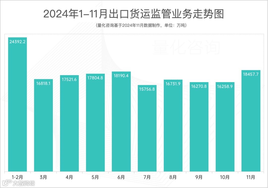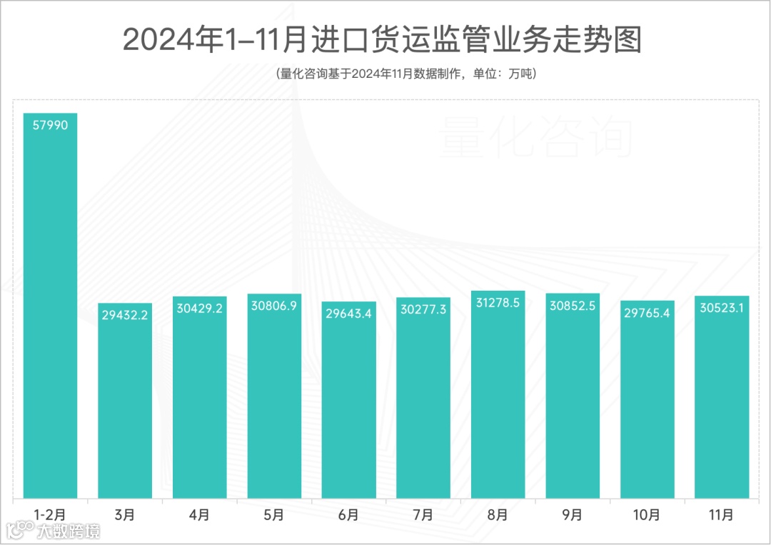 导读:海关总署同时也公布了前11月的全国进出口货运监管数据,2024年1-11月全国监管进出口货运量总量为509203.4万吨,2023年同期累计总量为486096.3万吨,同比增长4.8%。