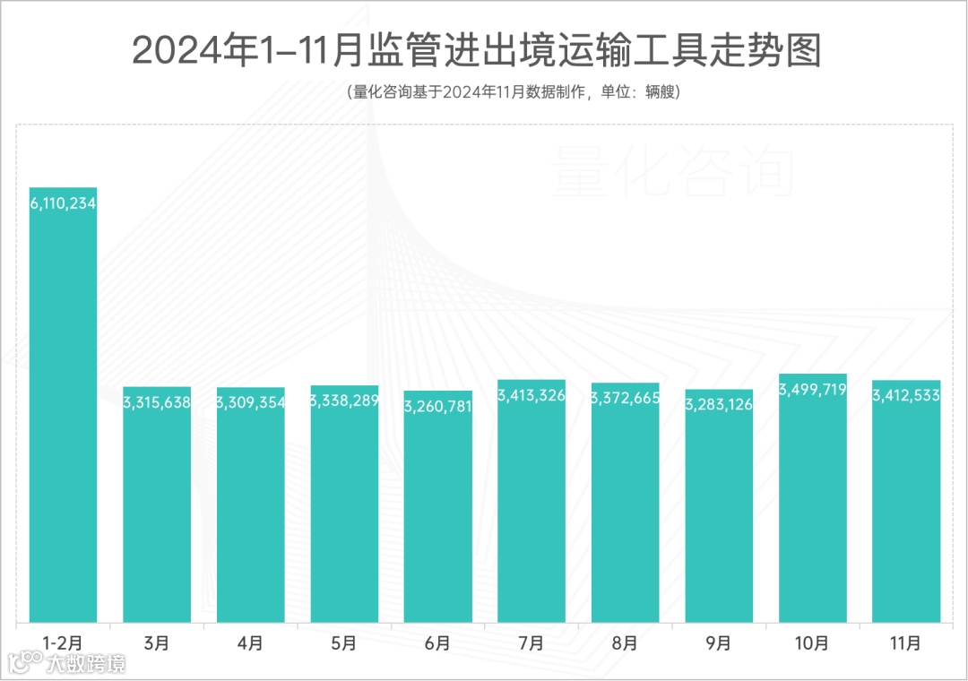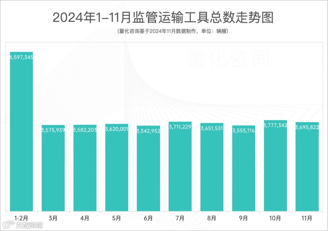 2024年1-11月,全国监管运输工具总数总量为39361686辆艘,2023年同期累计总量为31029829辆艘,同比增长26.9%,其中11月份为3695822辆艘,同比去年同期的3406530辆艘,增减值为8.5%。