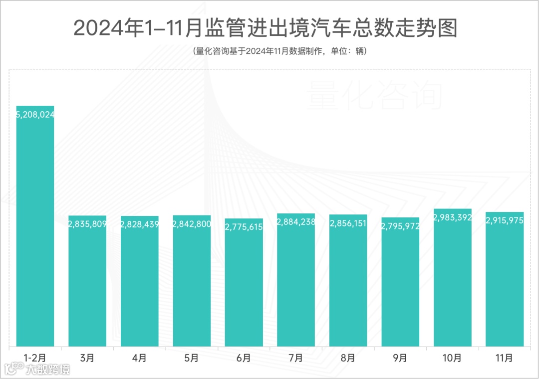 2024年1-11月,全国进出境汽车总量为30990339辆,2023年同期累计总量为23937786辆,同比增长29.5%,其中11月份为2915975辆,同比去年同期的2708474辆,增减值为7.7%。具体走势如下图: