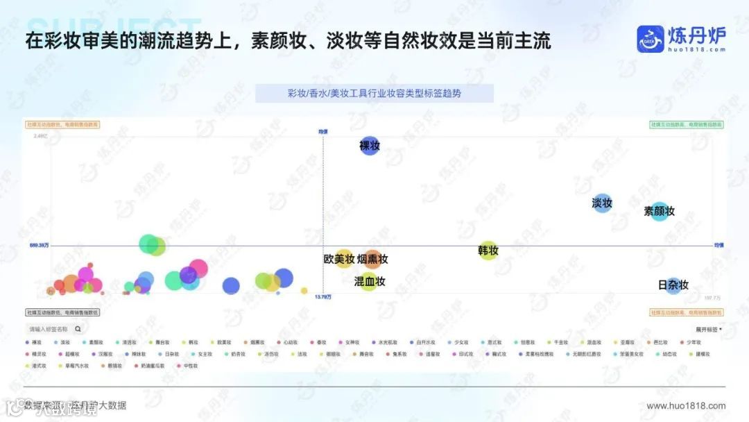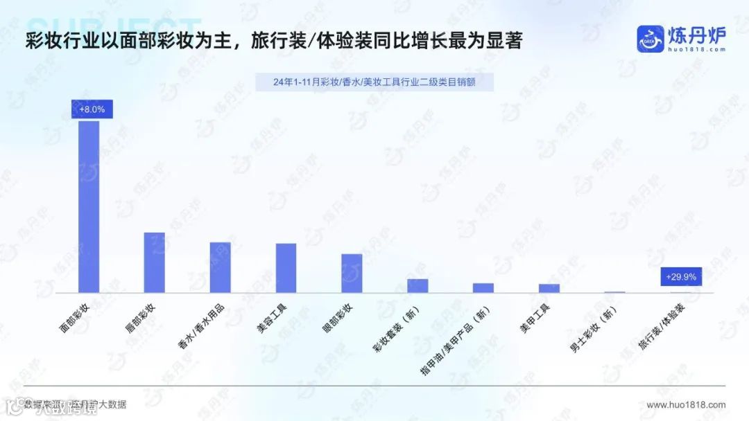 面部彩妆为主,旅行装,体验装同比增长最为显著。素颜妆、淡妆等自然妆效成为主流。