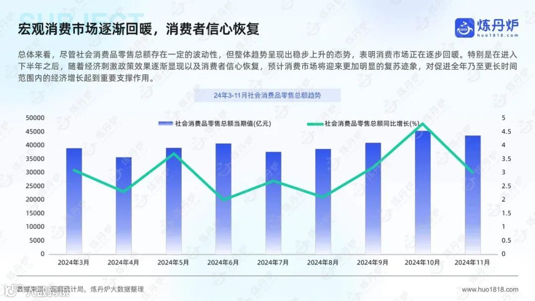 据国家统计局数据显示,2024年3月至11月,社会消费品零售总额虽有波动,但整体趋势向好,消费市场正在逐步回暖。特别是在下半年,随着经济刺激政策效果的显现和消费者信心的恢复,预计消费市场将迎来更明显的复苏迹象