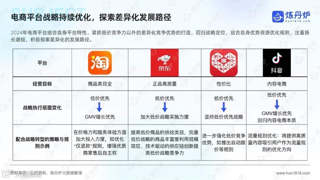 2024年,电商平台紧抓差异化竞争优势的打造,回归战略定位,优化规则,探索差异化的发展路径。例如通过加大低价战略实施力度、提高低价商品供给类别和优化流量规则等措施,电商平台在竞争中寻求突破。