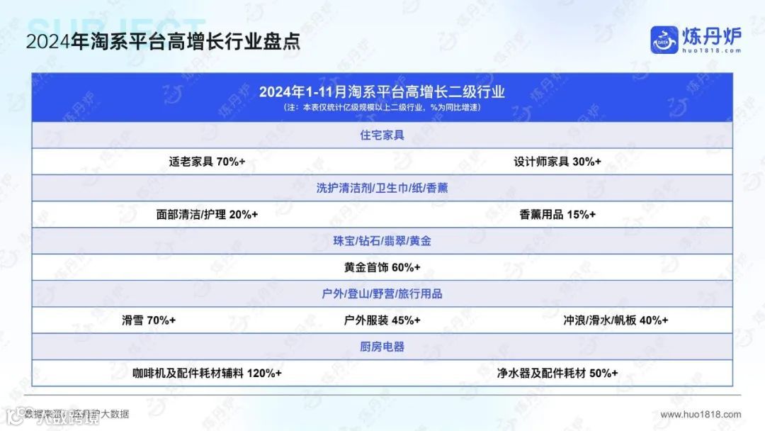 2024年1至11月,淘系平台住宅家具行业在淘系平台的销售额同比增长显著。其中,适老家具和设计师家具分别实现了70%多和30%多的同比增长。