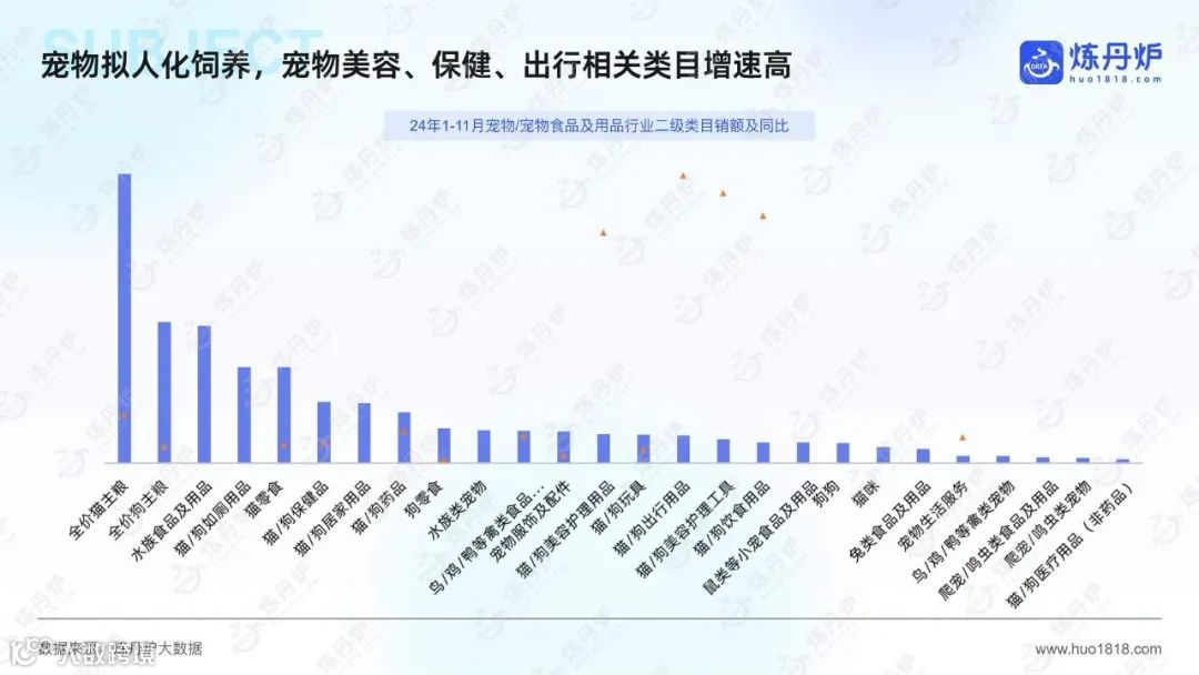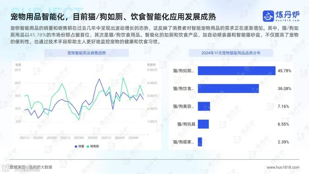 拟人化饲养趋势明显,宠物美容、保健、出行相关类目增速高。宠物用品智能化,目前猫狗如厕、饮食智能化应用发展成熟。