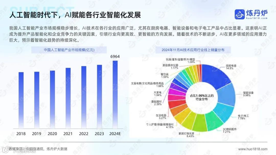 AI技术在各行业的应用广泛,尤其在厨房电器、智能设备和电子电工产品中占比显著,引领行业向更高效、更智能的方向发展。