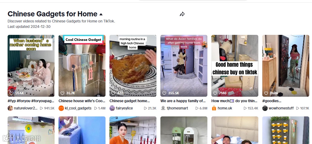 最为典型的是,在 TikTok 上有这样一个特别的话题叫 #Chinese Gadgets for Home,这个标签目前已累计了超 8000万条帖子,视频内容都是介绍一些值得购买的中国家具电器产品。