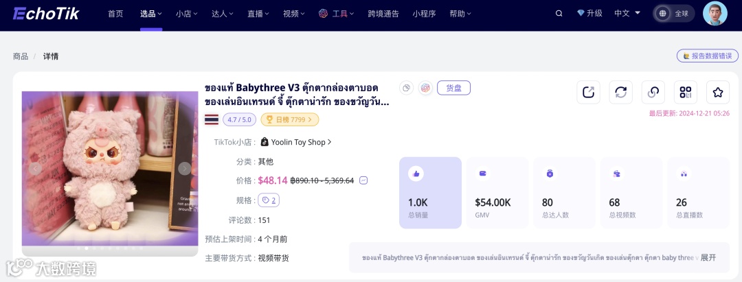 东南亚TikTok开出了不少小店,专门售卖这些潮玩IP。这家跨境泰国TikTok小店,在近3个月狂卖5000多件!