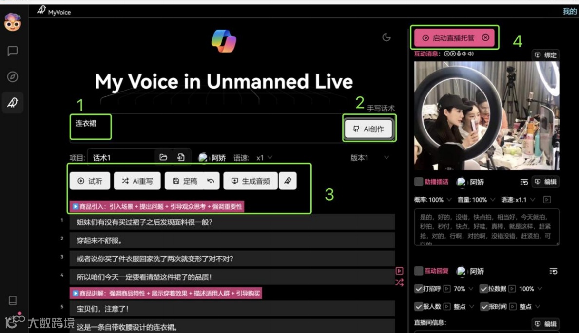可快速生成直播脚本的人工智能自动写手,内置多国语言和人声自动转译,支持自动合成直播间声音