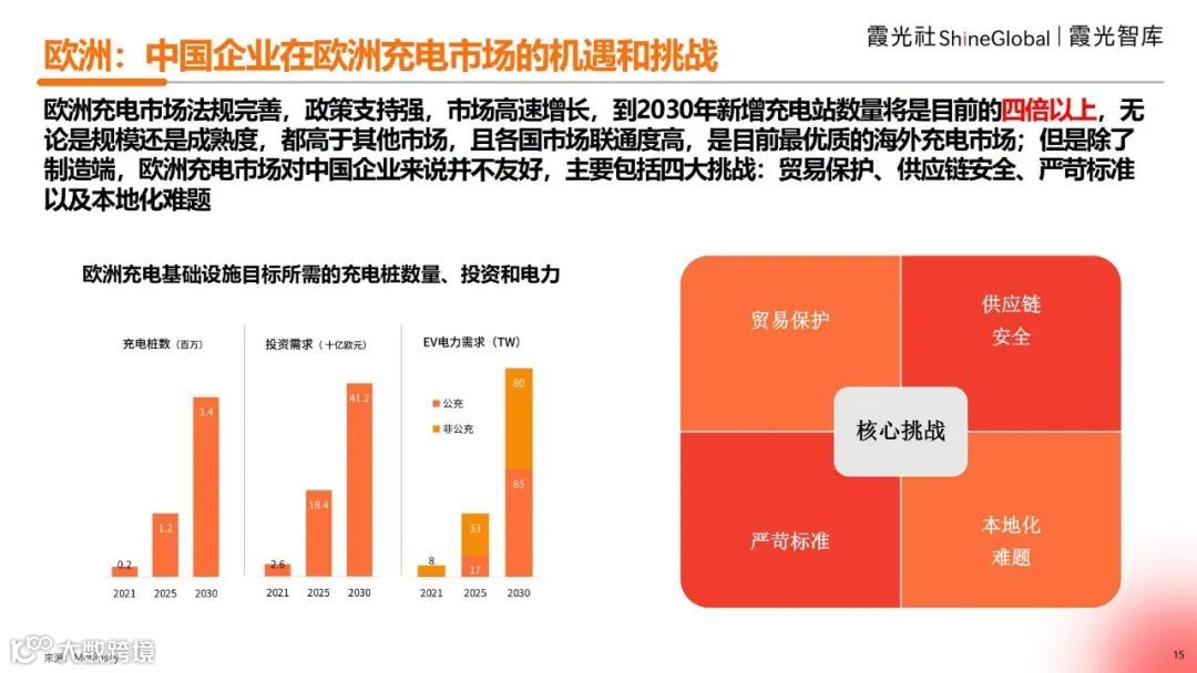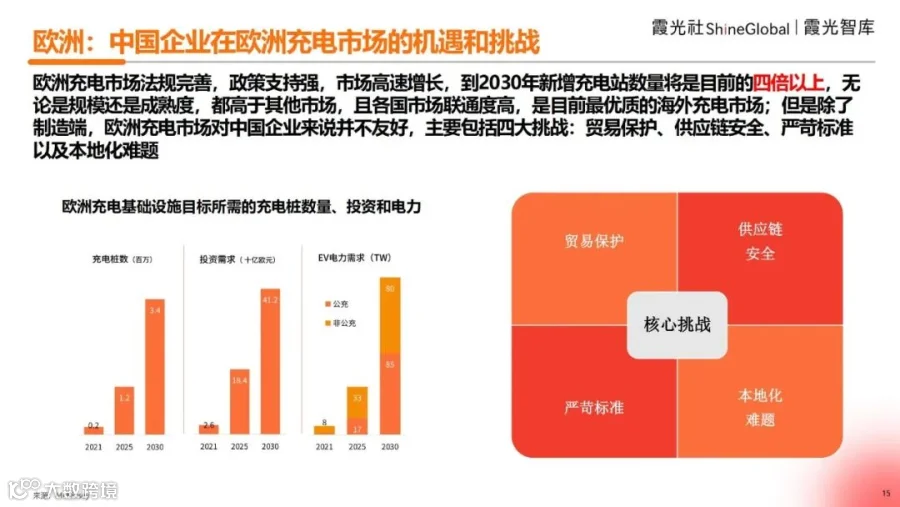 综上,对于欧洲市场来说,无论是政府支持力度还是充电基础设施布局,相较其他海外市场整体表现较为成熟,预计2030年新增充电站数量将是当前的四倍以上。但是,中国充电企业若想进入欧洲,会面临贸易保护、供应链安全、严苛标准以及本地化难题这四大核心挑战。