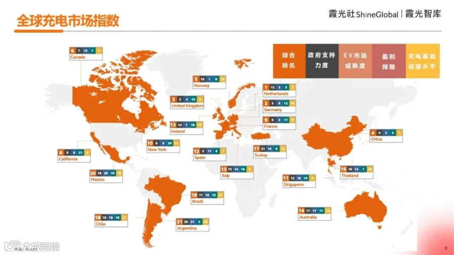 全球充电市场指数综合评估了政府支持力度、市场成熟度、盈利预期和充电基础设施水平四大指标维度。