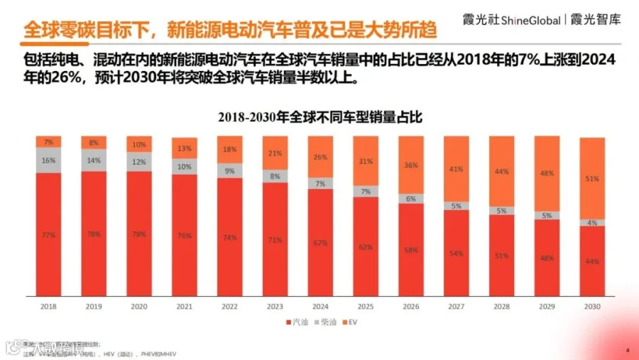2018年,包括纯电、混动在内的新能源电动汽车在全球汽车销量中的占比仅为7%,随着全球零碳目标的逐步实施落地,2024年这一数据上涨到26%,预计到2030年新能源电动汽车将突破全球汽车销量半数以上。因此,新能源电动汽车的全球普及已然成为大势所趋。