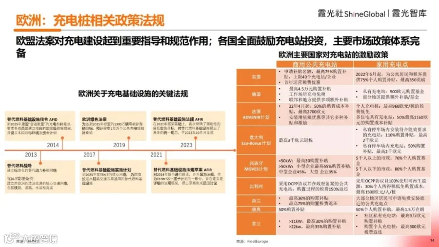 从2013年起,欧洲就出台了“替代燃料战略”,近十年也在逐步规划落地。欧洲不同国家也分别针对家用和公共充电桩出台了一系列激励政策,包括购置补贴以及税收优惠等,基本政策体系相对比较完善。