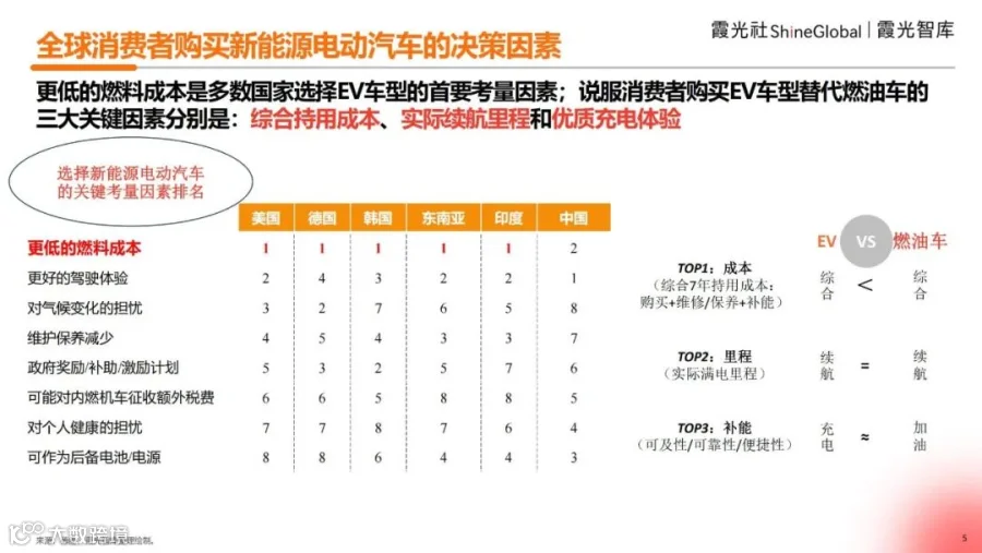从全球消费者购买新能源电动汽车的考量因素来看:通过对新能源电动汽车全球几个主要区域市场国家进行消费者调研,让消费者对更低的燃料成本、更好的驾驶体验、维修保养、政府补贴、个人健康等8个决定购买新能源汽车而非燃油车的原因进行优先级排名,在美国、德国、韩国、东南亚、印度和中国的排名中,除中国外另外五个国家的消费者均将“更低的燃料成本”作为选择购买新能源电动汽车的首要考量因素。