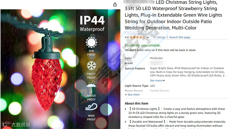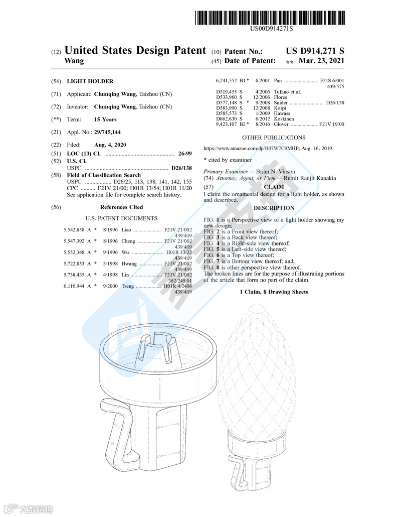 本案是12月3日Bole Yuan, Esq.律所代理国人卖家CHUNQING WANG发起的专利维权,涉案产品为一款户外串灯灯座,美国专利号为:D914271,于2021年5月23日取得美国外观专利证书。跨境卖家需留意,避免踩雷。