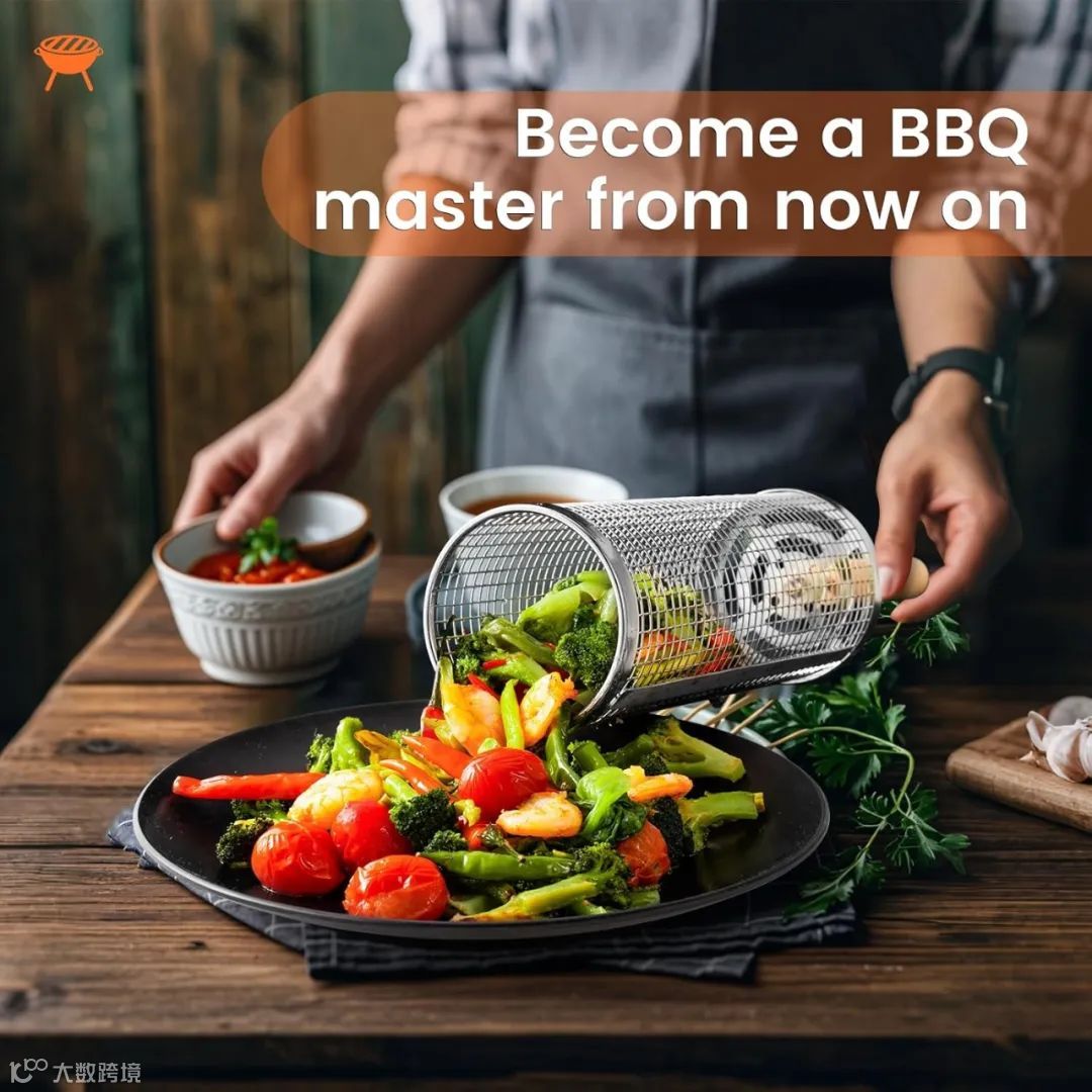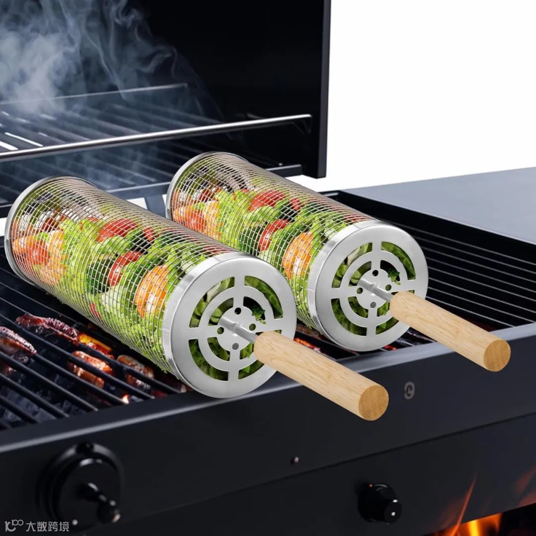 这款烧烤器材是一个圆柱体的笼子,将菜品都放在一起,四周是铁丝网,烧烤的时候手拿把手旋转,可以让食物受热更加均匀。