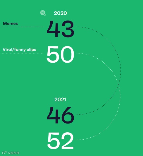 根据GWI的研究,这类内容是人们在线消费增长最快的内容之一。在2020年第二季度,43%的活跃社交媒体用户表示,他们上个月在社交媒体上看过表情包。仅仅一年后,这一比例就上升到了46%。病毒式传播/搞笑视频也出现了类似的增长,而更“传统”的在线内容——如朋友/家人发布的帖子或新闻视频——没有出现太多上升趋势。