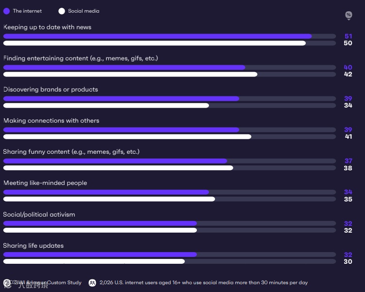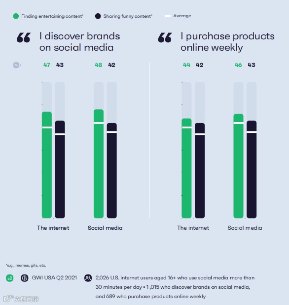 然而,最能说明问题,也是与我们理解网络文化最相关的是娱乐在我们如何度过网络时光中变得多么重要。当人们上网和使用社交媒体的动机越来越大时,寻找有趣的内容,比如memes、gifs、视频等——排在第二位,取代了除新闻发现之外的一切。