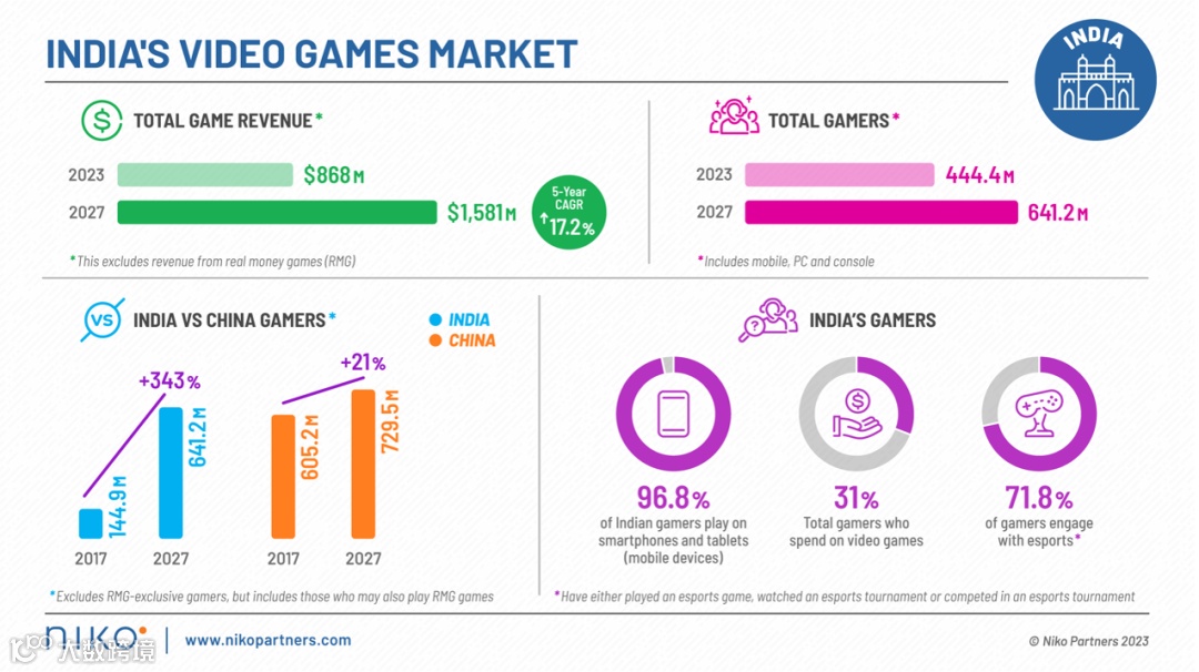 根据 Niko Partners 的数据,到2023年,印度游戏市场的收入大约为8.68亿美元,且预测到2027年能增长将近一倍,游戏玩家数量也预计能达到6亿多人。