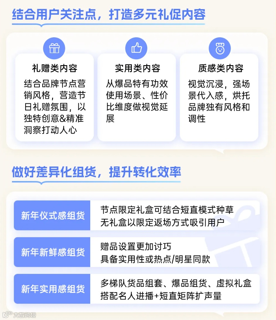此外,在新年实用感方面,则可以结合梯队货品组套、爆品组货、虚拟礼盒,搭配名人进播与短直矩阵,进一步提升货品声量。