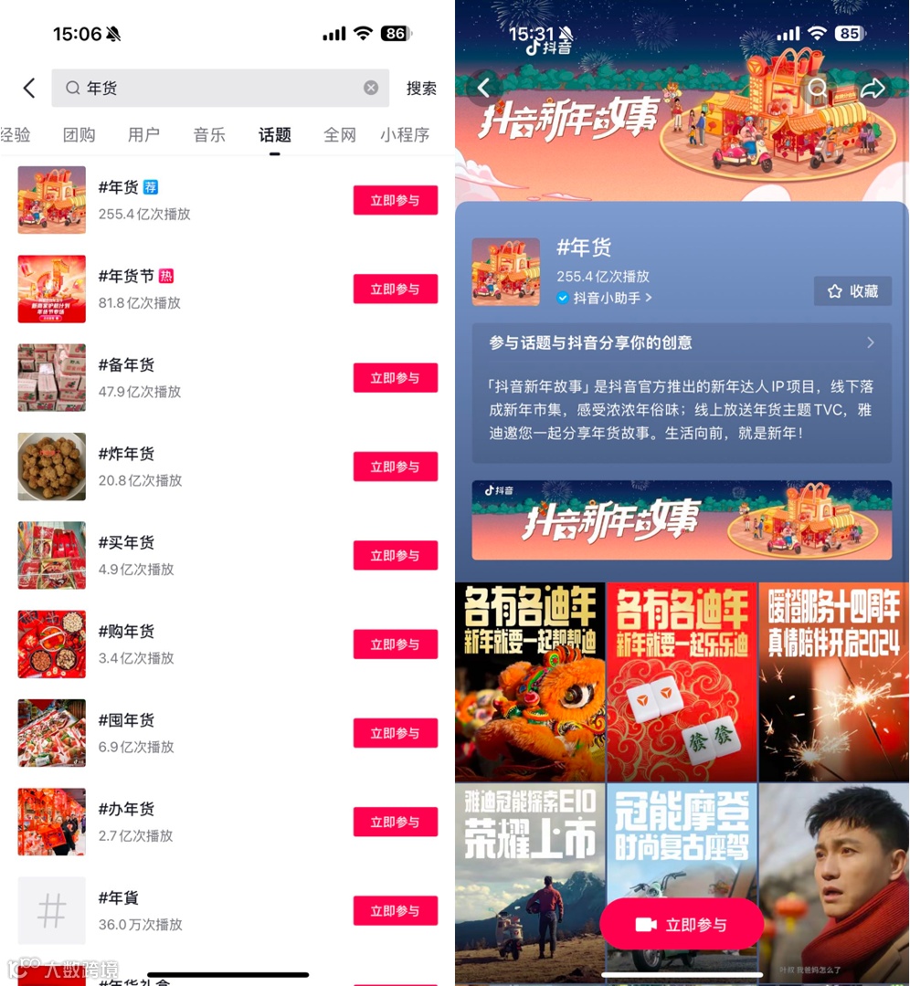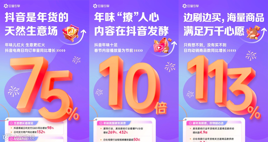 毋庸置疑,对于品牌商家而言,春节相关内容在抖音已展现出强劲的爆发力,不仅在站内迅速发酵并形成热点趋势,也借由多元化的内容话题持续刺激着用户的年货需求。