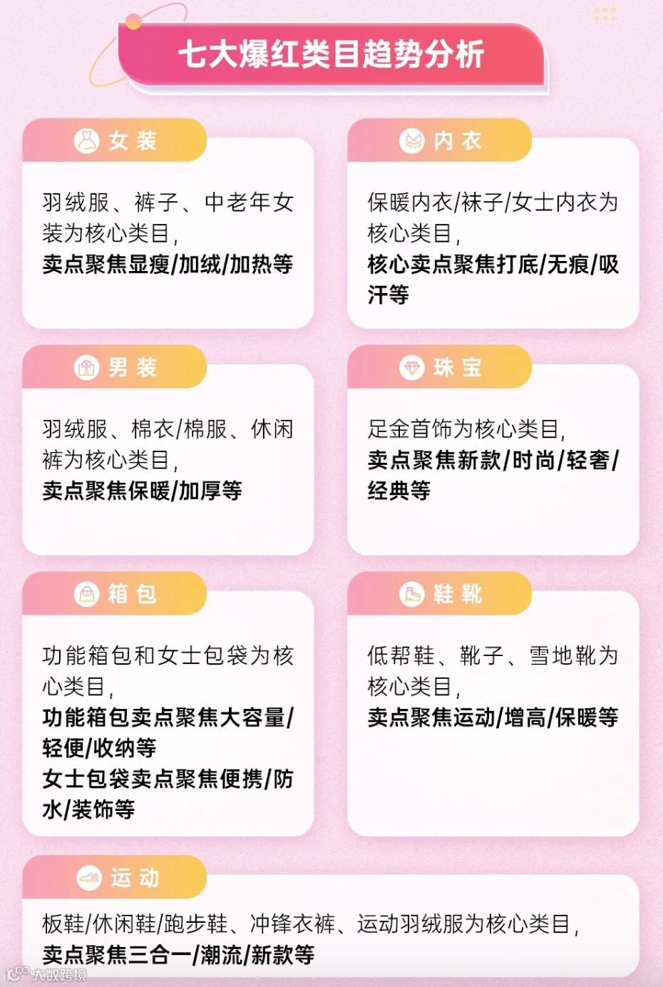 「组红货」层面,围绕着用户“新年新气象,过年买‘战袍’”的消费心智,品牌商家可以聚焦七大爆红类目,包括女装、运动、内衣、男装、珠宝、箱包和鞋靴。同时,结合不同的消费诉求,品牌商家也能够更有针对性地组货,提升货品经营效率。