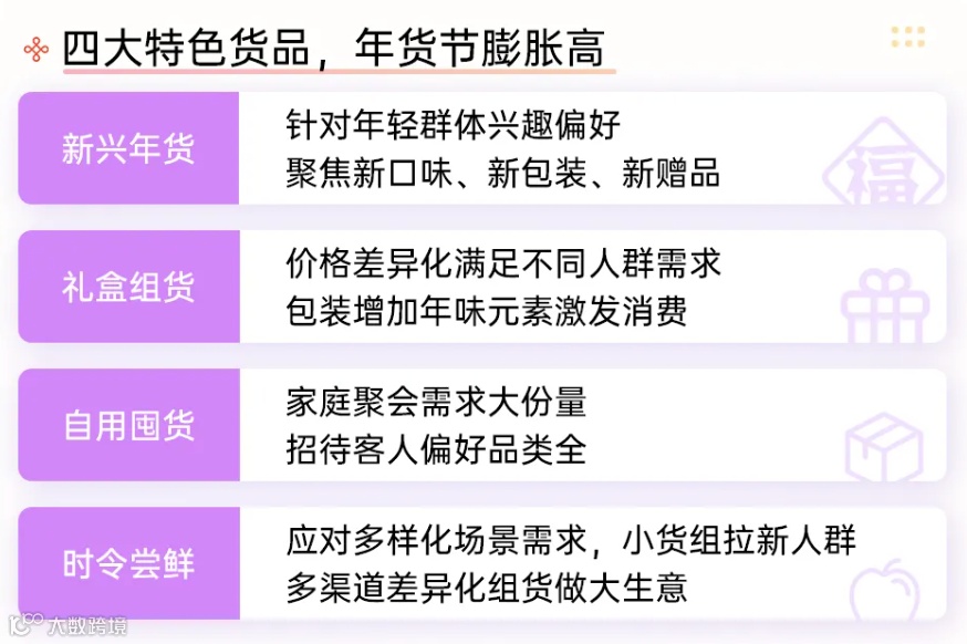 其次,针对不同的人群与消费需求,做好货品布局,承接消费需求,其中可重点聚焦四大特色货品策略:新兴年货、礼盒组货、自用囤货、时令尝鲜。