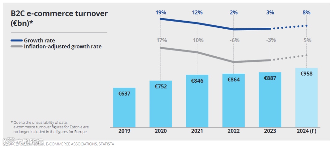 根据数据分析平台ECDB报告,2023年欧洲电商市场规模为8000多亿美元,预计2026年将突破万亿美元大关,达到1.1万亿美元。据Statista数据,2024年欧洲B2C电商营业额预计将稳健增长8%。