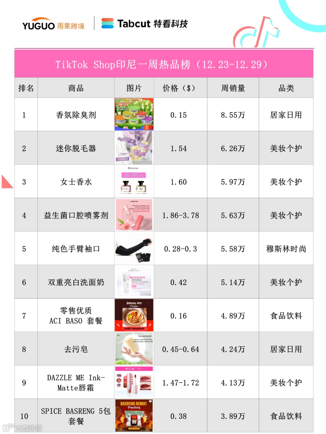 在本期印尼热销品榜单中,香氛除臭剂力压一众美妆个护商品,牢牢占据榜一位置,除此之外,身体清洁用品和调料套餐也在本期各位受印尼消费者的偏爱,纷纷卖出了不错的销量。